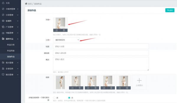 教程分为操作视频介绍和文档介绍:视频教程1、添加作品分类2、添加作品文档教程一、添加作品分类根据小程序模板设置的不同,有的模板设置了作品分类,而有的则没有;有的模板设置了作品分类显示封面图,而有的模板仅显示作品分类并不显示分类图。那么,大家...